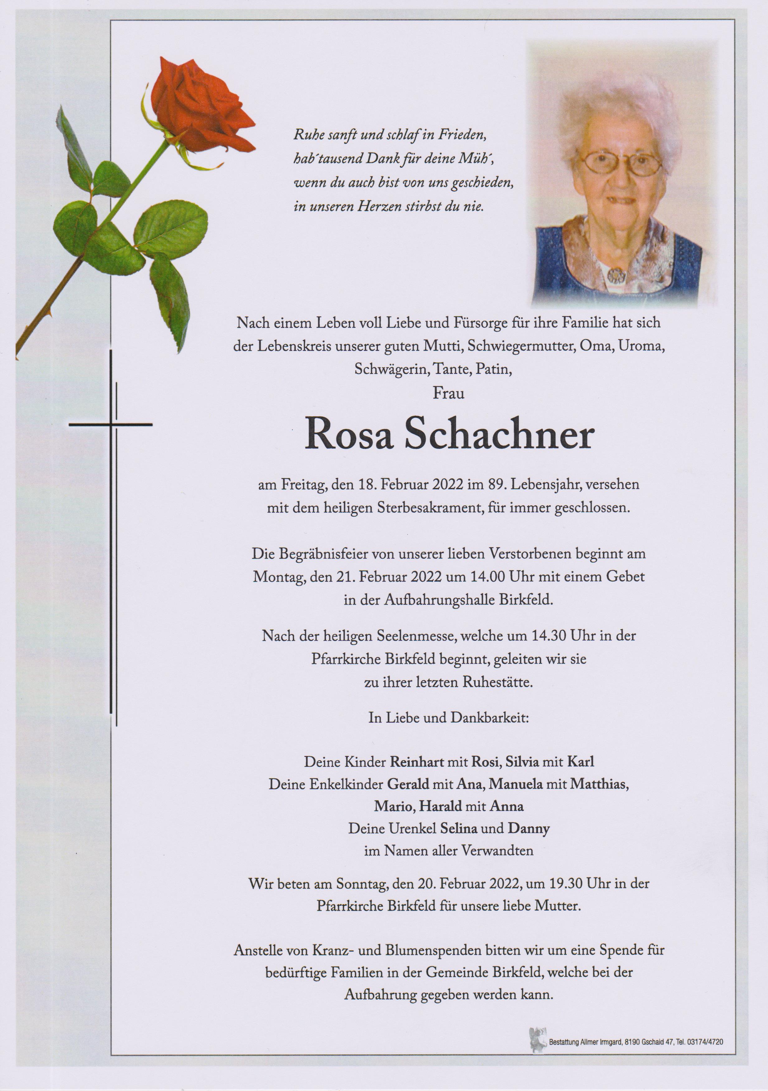 Liebe Tante Rosi! Voll liebevoller Erinnerung an schöne gemeinsame Stunden. Möge dieses Licht dich auf deiner letzten Reise begleiten. Erni und Walter mit Familie. AUFERSTEHUNG IST UNSER GLAUBE. WIEDERSEHEN UNSERE HOFFNUNG. GEDENKEN UNSERE LIEBE