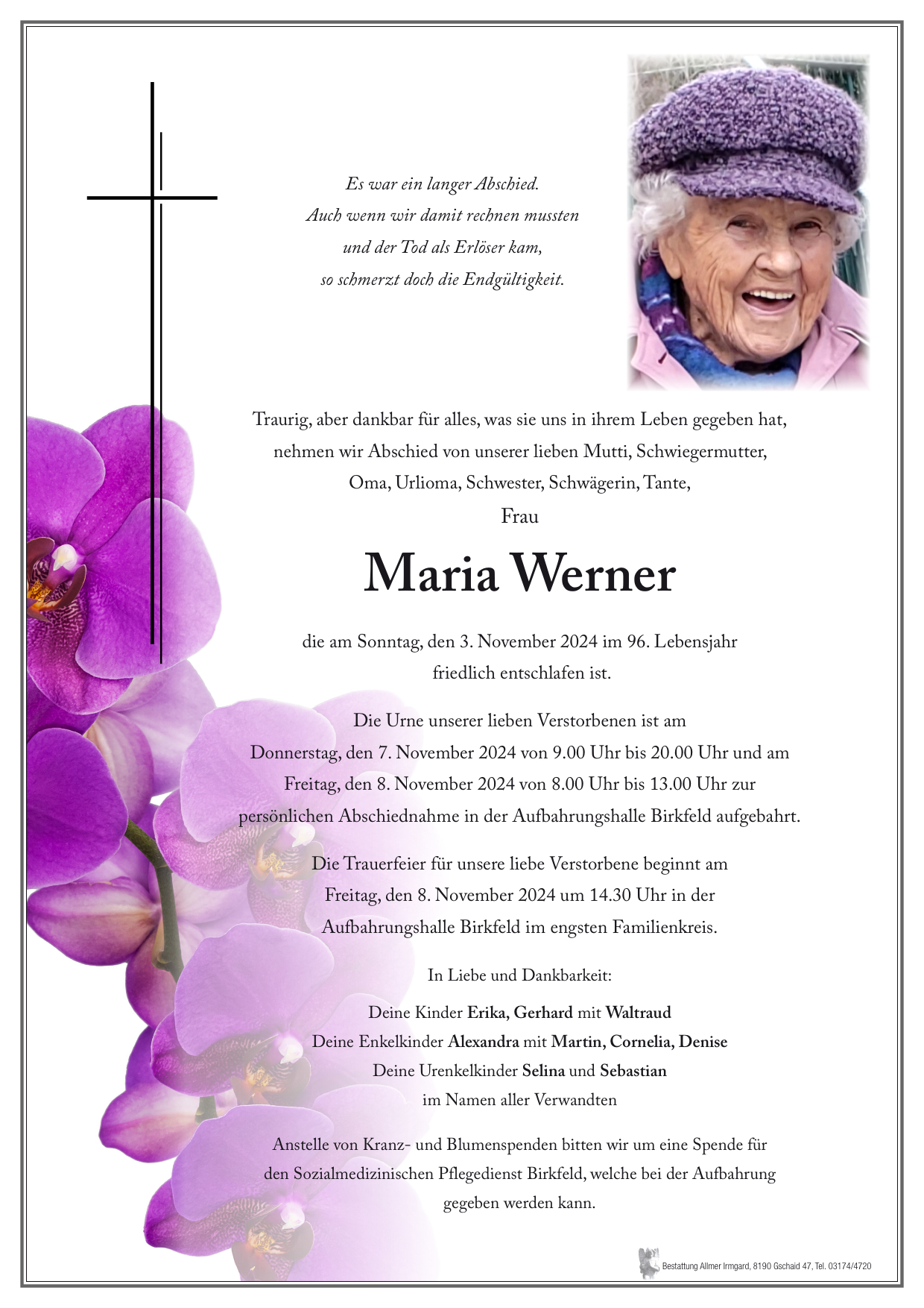 Mein herzliches Beileid lieber Gerhard, liebe Erika ! Ruhen sie in Frieden Frau Werner ! Ingrid Schellnegger ..ehemals Baumegger aus Weiz