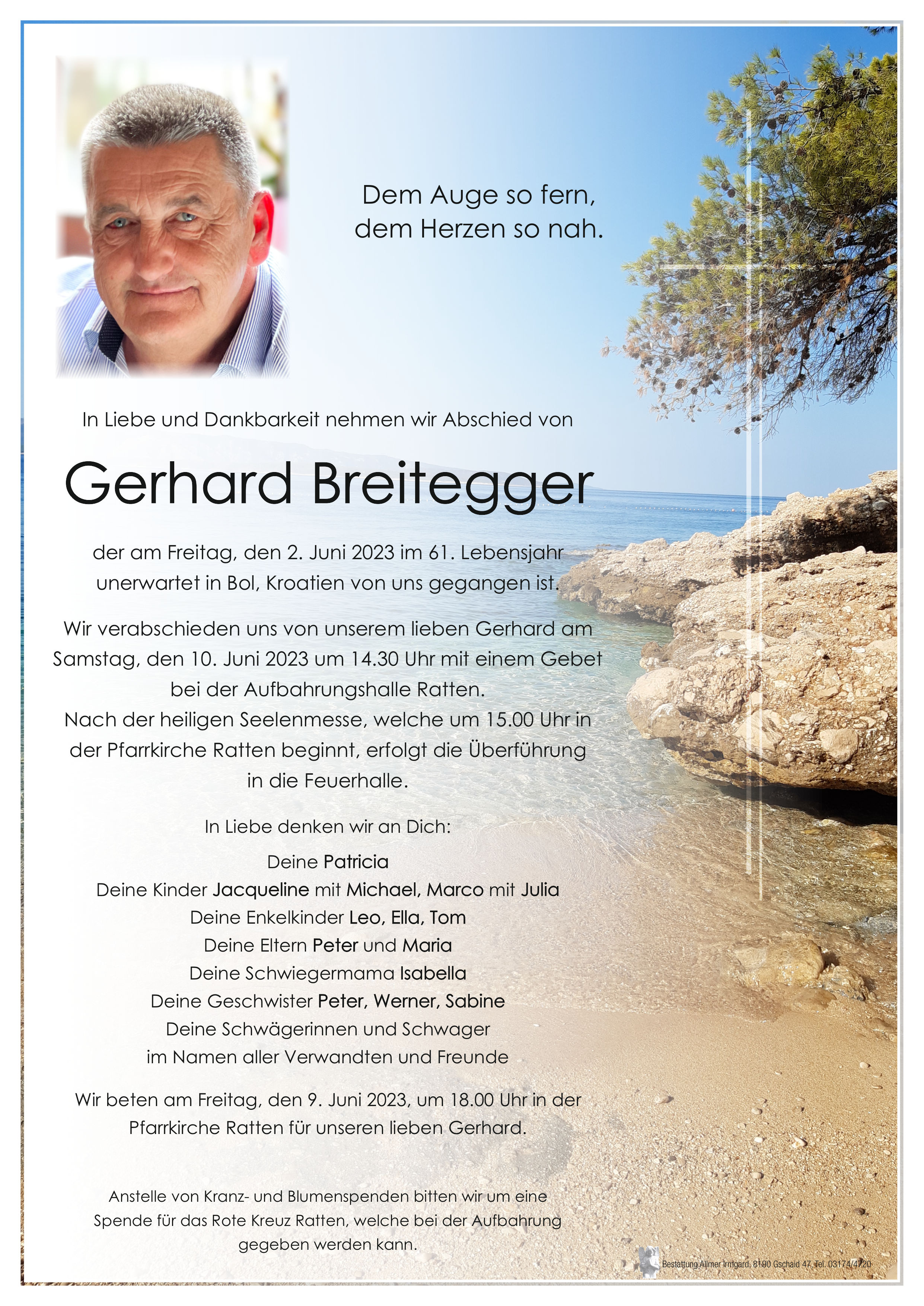 Trauern ist liebevolles Erinnern. Pfiat di lieber Gerhard und pass gut auf deine Familie auf. Aufrichtige Anteilnahme Waltraud mit Karl, Nicole und Carina