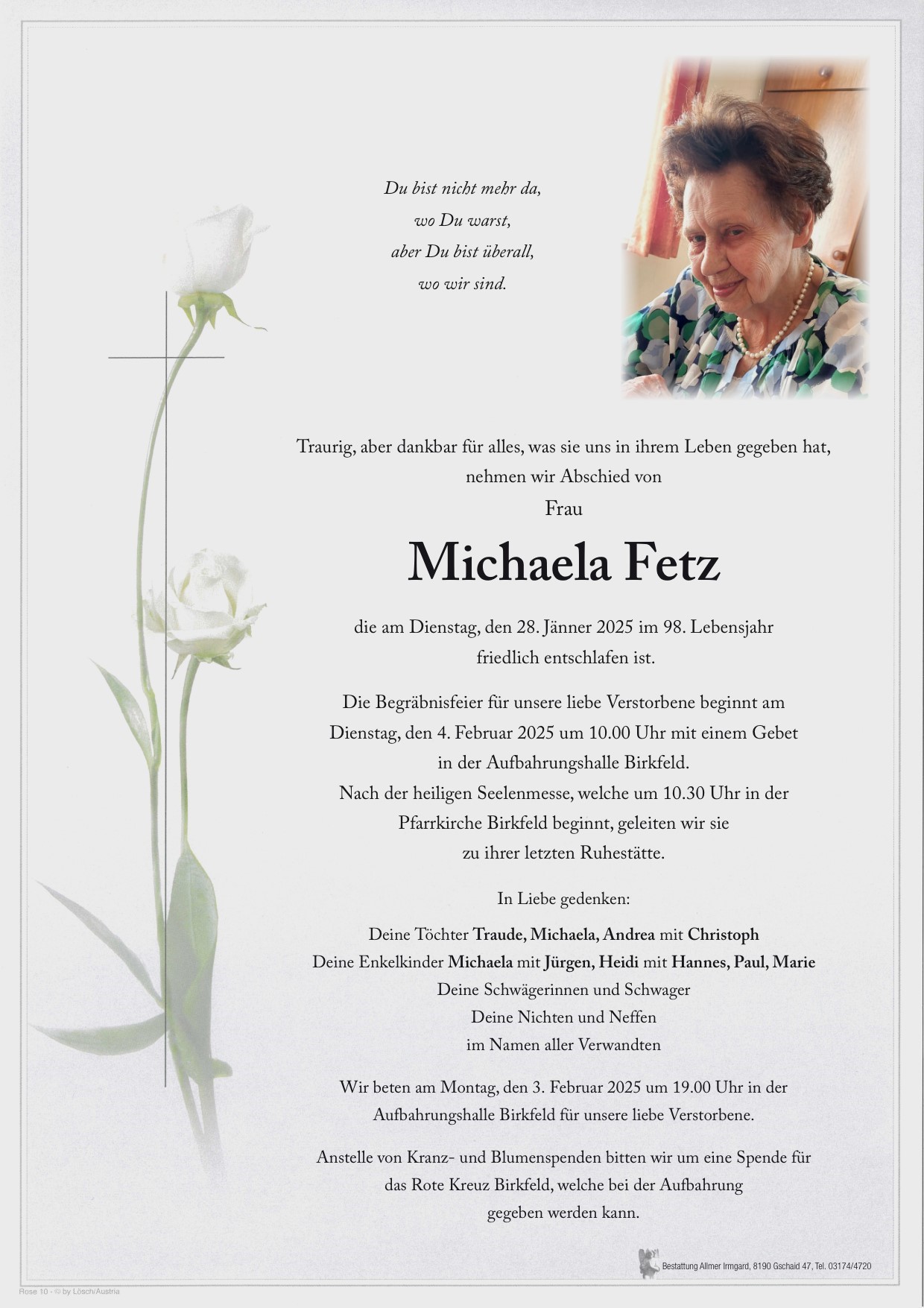 Mein Aufrichtiges Beileid liebe Michaela, viel Kraft in dieser schweren Zeit, deine Arbeitskollegin Christa.