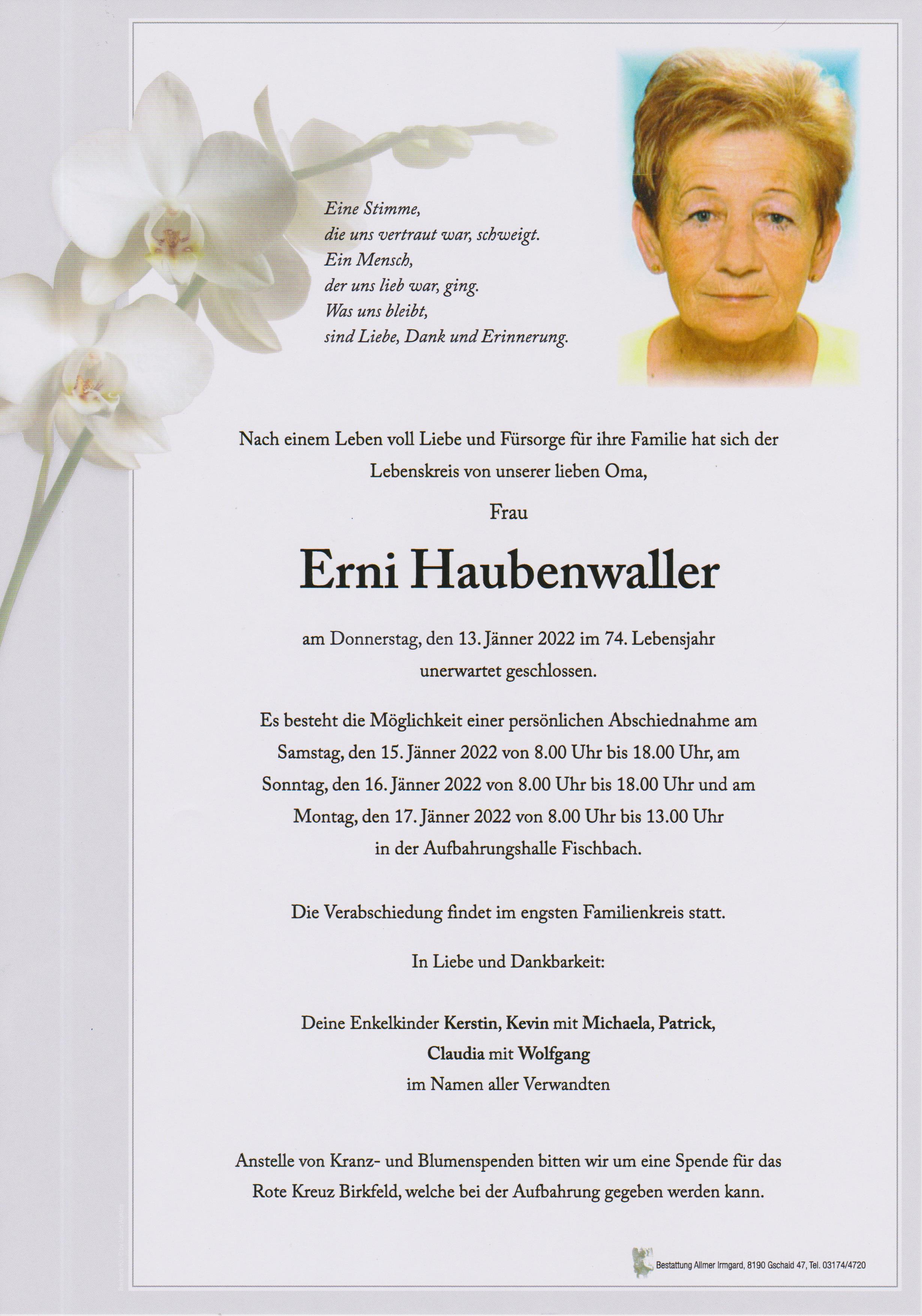 „Die Erinnerung ist ein Fenster, durch das ich dich sehen kann, wann immer ich will." Ruhe in Frieden, liebe Erni! Dein Patenkind Silvia mit Familie
