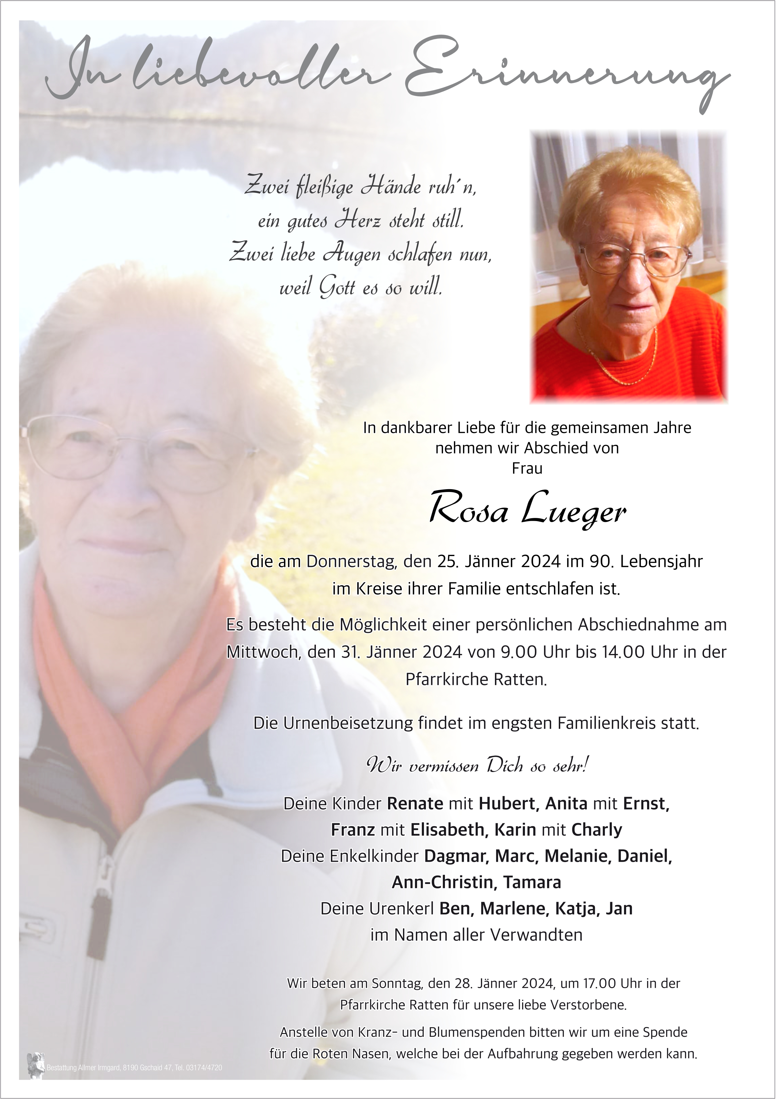 Liebe Tante Rosi! Ruhe in Frieden! Unser aufrichtiges Beileid deiner Familie! Patenkind Christi mit Peter u. Familie