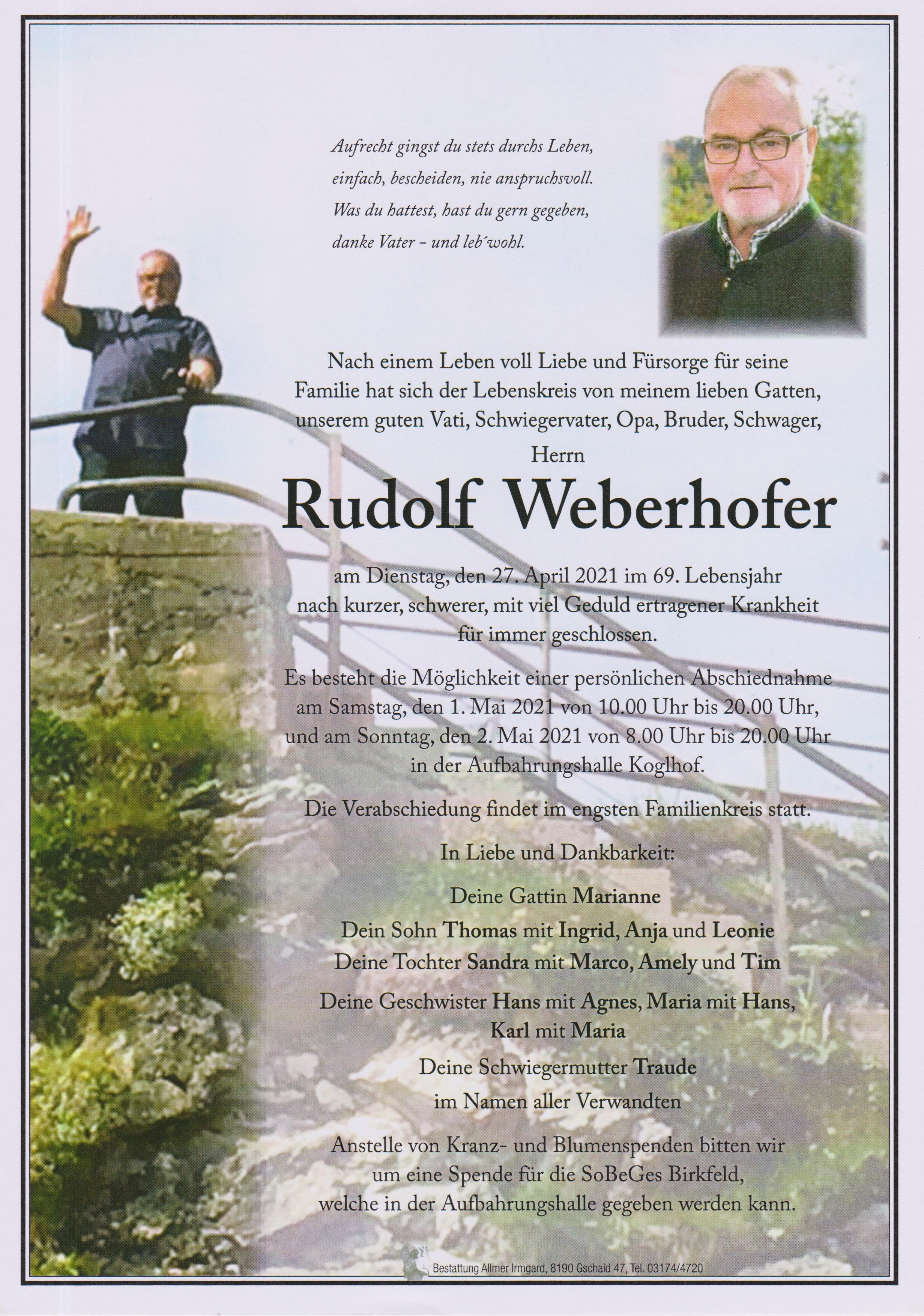 Unser aufrichtiges Beileid der Familie. Ruhe in Frieden lieber Rudl. Fam. Martina und Stefan Schwaiger